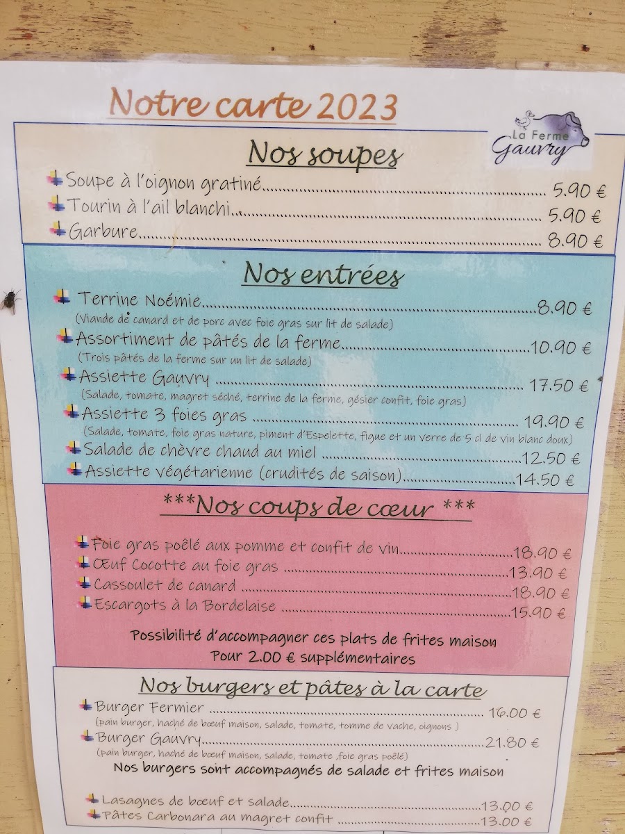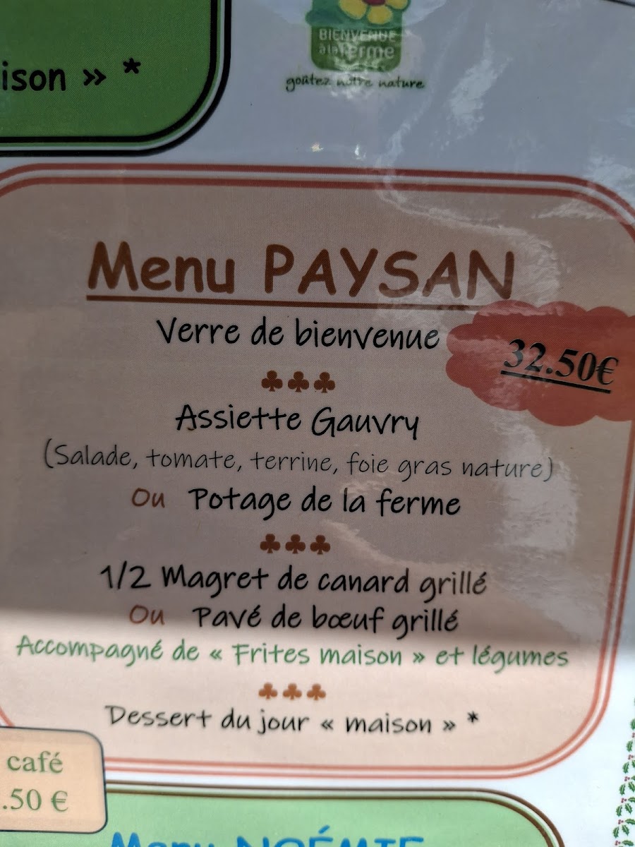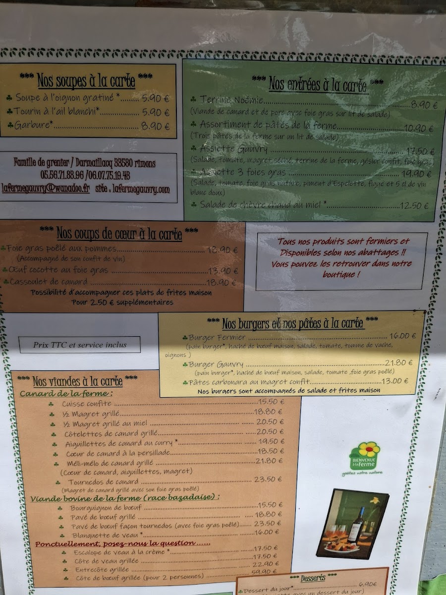 The menu at Ferme-Auberge Gauvry offers a delightful array of dishes that capture the essence of French country cuisine, with a focus on fresh, locally sourced ingredients. A standout is the Pavé de Boeuf, a perfectly cooked beef steak that is both tender and flavorful, making it a must-try for meat lovers. For those who appreciate fine charcuterie, the Assortiment de Foie Gras offers a rich selection of foie gras, beautifully paired with traditional accompaniments. The dessert menu features the indulgent Creme Brulee, which is a creamy, caramelized delight that provides the perfect ending to any meal. If you're in the mood for something more casual, the Burger Fermier is a delicious option, offering a farm-fresh twist on the classic. Additionally, the Colas Bio Sans Cafeine provides a refreshing caffeine-free alternative, allowing guests to enjoy a unique beverage with their meal. With these exceptional dishes, Ferme-Auberge Gauvry succeeds in offering a menu that is both refined and comforting, making it a memorable dining experience.